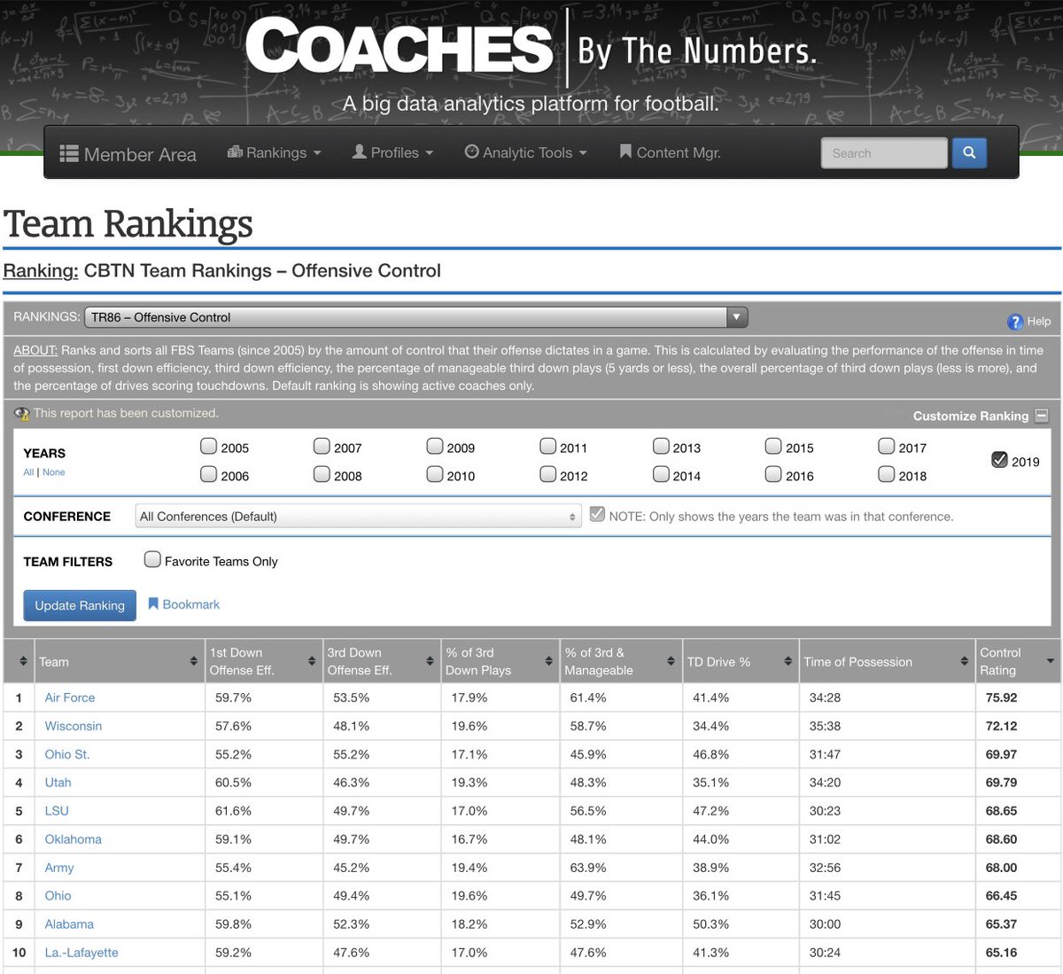 Loving our new CBTN Offensive Control Rating score. Proprietary formula looks at the following categories: % of drives resulting in a TD, 1st down efficiency, 3rd down efficiency, % of 3rd dwn plays, % of 3rd dwns of 5 yds or less, & TOP. Here are top 10 w/highest scores in 2019:pic.twitter.com/1BUr4Y7bfs