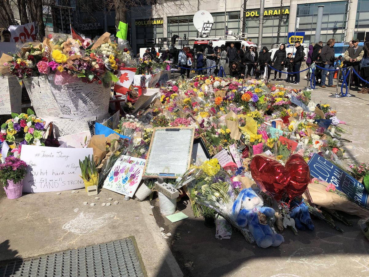 From CBC's @FarrahMerali in Toronto: Messages in chalk on the ground below bouqets of flowers in Mel Lastman square where preparations are underway for tonight’s vigil for the victims of Monday’s van attack.pic.twitter.com/KIdQVfnGmH