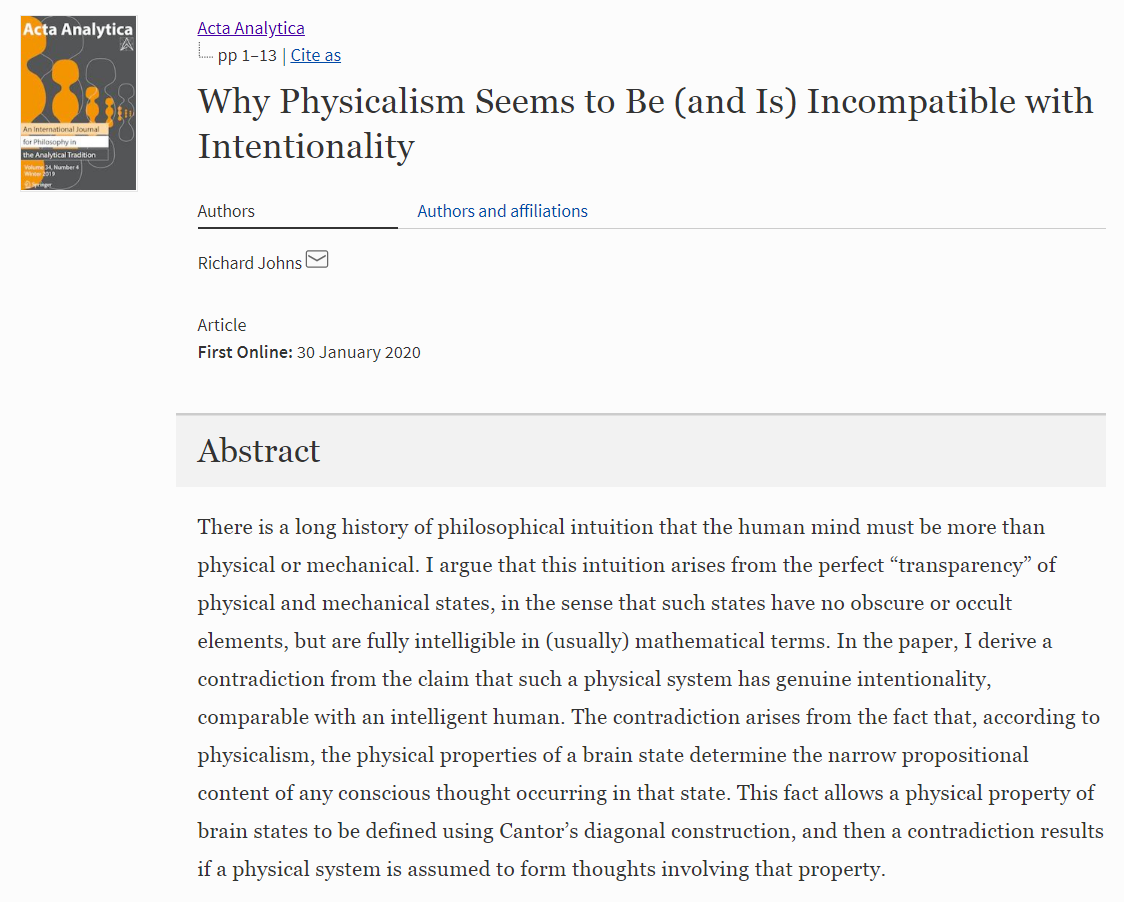 Acta Analytica Why Physicalism Seems to Be (and Is) Incompatible with Intentionality Richard Johns http://ow.ly/CjUZ30qdLBa pic.twitter.com/jadBKRtNqy