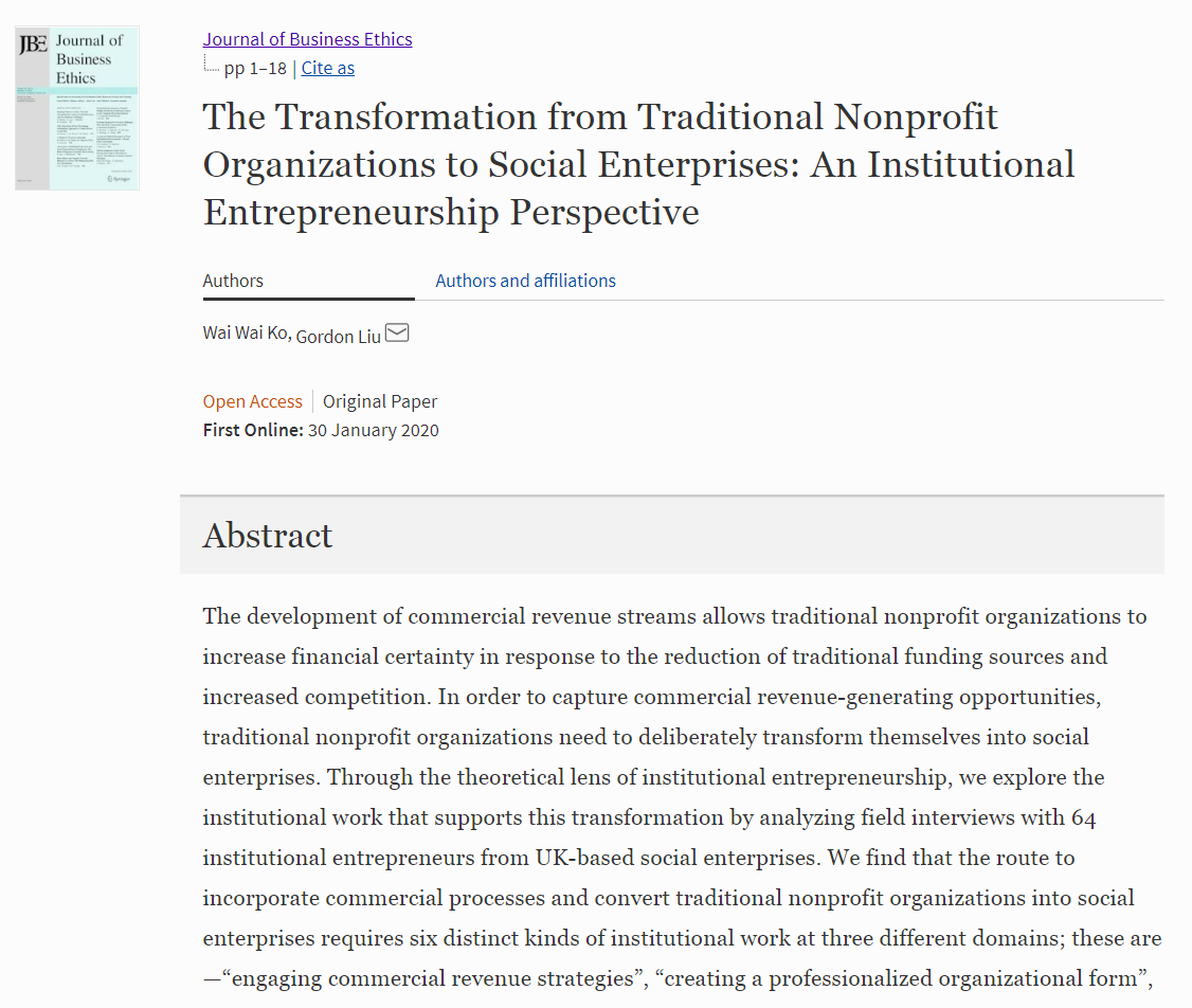 Journal of Business Ethics The Transformation from Traditional Nonprofit Organizations to Social Enterprises: An Institutional Entrepreneurship Perspective http://ow.ly/VAy430qdLAQ pic.twitter.com/KIsEqMLUWq