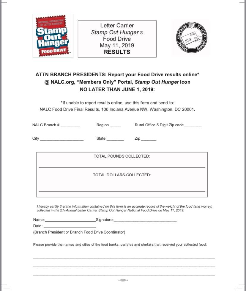 Thanks to the volunteers & food banks who helped make the 27th annual #StampOutHunger food drive a big success. Now it's time to report your final numbers. You can report your food drive results online on the NALC website inside the "Members ONLY" portal–do it by June 1, 2019.pic.twitter.com/DKtAPJm1bu