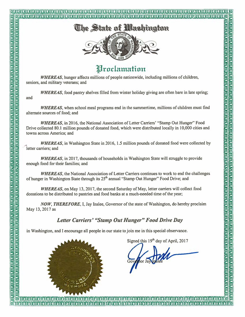 Washington @GovInslee has declared Sat., May 13, “Letter Carriers’ Food Drive Day” in that state. #StampOutHunger https://www.nalc.org/food pic.twitter.com/UdKmS85v7P