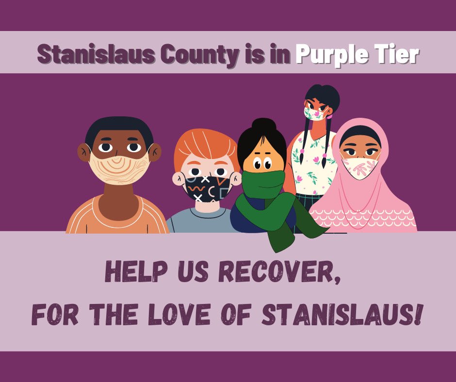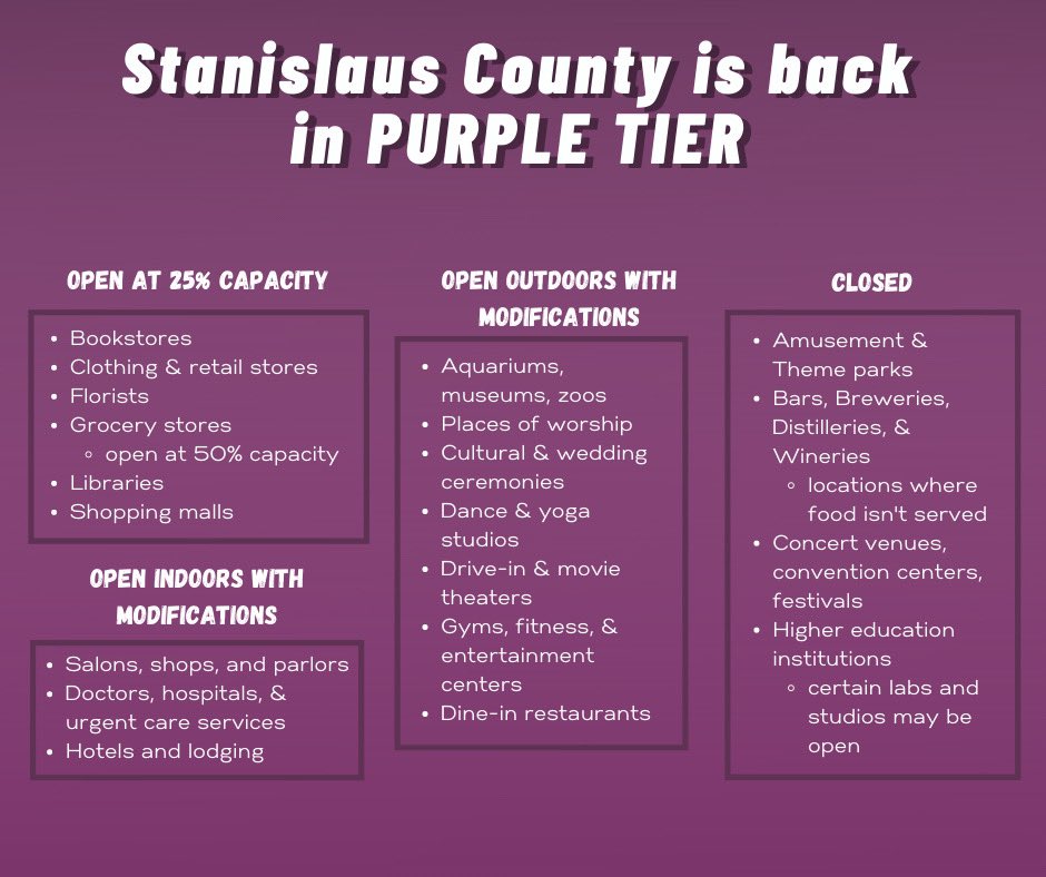 Due to an increase in spread, the California Department of Public Health (CDPH) has reassigned Stanislaus County into the most restrictive “Purple” tier effective immediately. To view restrictions visit: https://covid19.ca.gov/safer-economy/ pic.twitter.com/eTKvwD6KHY