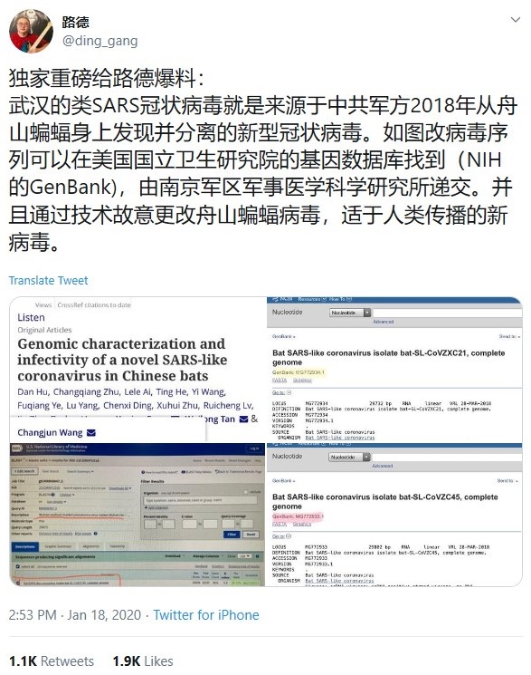 @ding_gang)武汉肺炎新型冠状病毒来源于中共军方技术改造的舟山蝙蝠病毒证据!!pic.twitter.com/qO0C7KrBKB