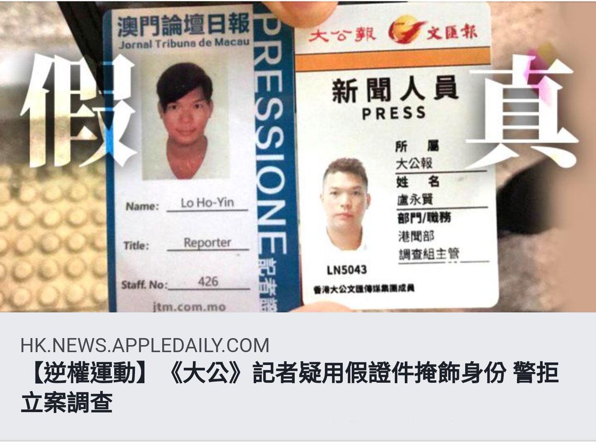 假記者重溫:《大公》記者疑用假證件掩飾身份 警拒立案調查 至於以下真記者嘅老闆已被捉&控告,報道亦已經刪哂睇唔返pic.twitter.com/4sPnXKAMqB