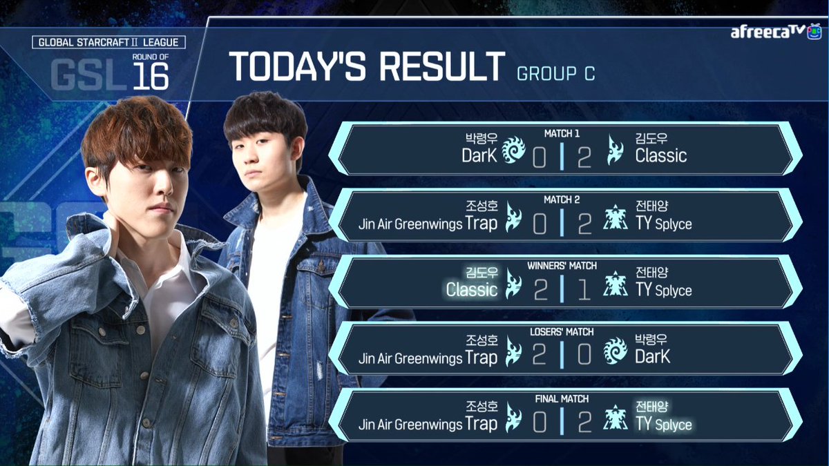 Congratulations to @SC2_Classic and @Splyce_TY who advance from Group C to #GSL Ro8!pic.twitter.com/GSOnLSyFbS