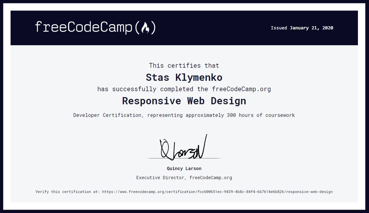 My first certificate in 2020. Thank you @freeCodeCamp and@ossia for this opportunity and knowledge!#100DaysOfCode#301DaysOfCode#CodeNewbiepic.twitter.com/RbzsH69QA5