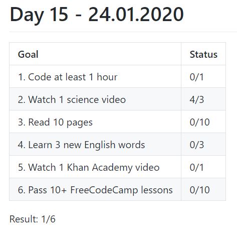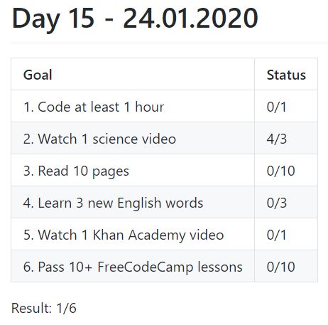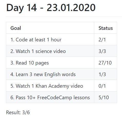 Yesterday I almost did all the goals, but haven't time to learn new words and was too tired to finish a few FreeCodeCamp lessons. Anyway, I feel like I did enough for one day.