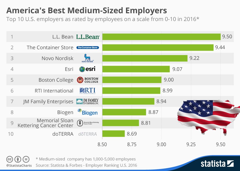 @LLBean ranks first on our new ranking of America's Best Medium-Sized Employers#employers https://www.statista.com/chart/4576/americas-best-medium-sized-employers/ …pic.twitter.com/onz2uJoi6T