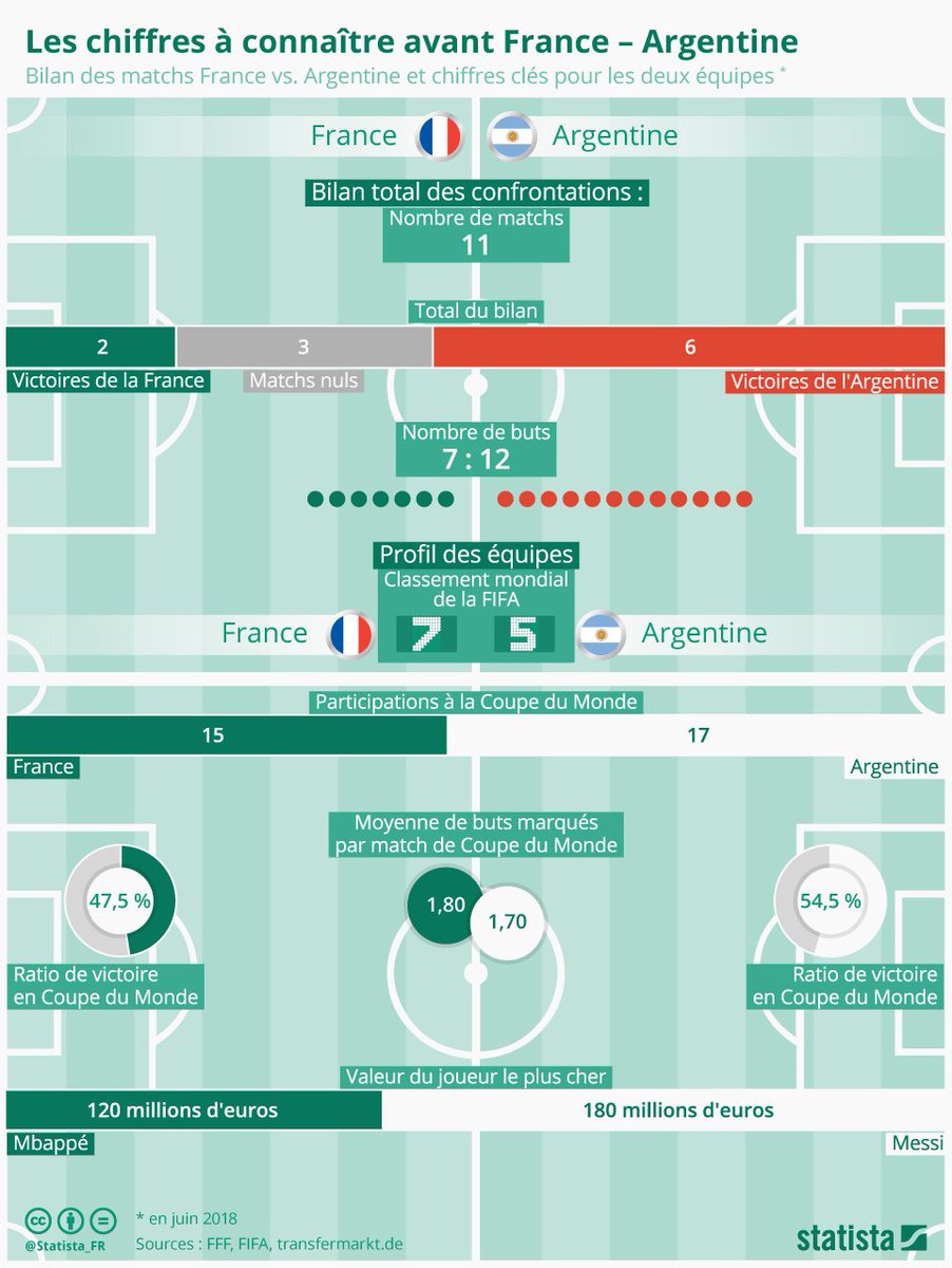 Retrouvez le bilan des confrontations entre les 2 équipes et les chiffres clés sur notre infographie du jour : https://fr.statista.com/infographie/14457/les-chiffres-a-connaitre-avant-france---argentine/ …pic.twitter.com/Nw33wf7jtE