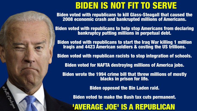 Biden also helped create the greatest tax cuts for the rich. He voted for Reagan’s tax cuts twice, top marginal tax rate went from 70% to 28%. Biden’s voting record is horrendous.