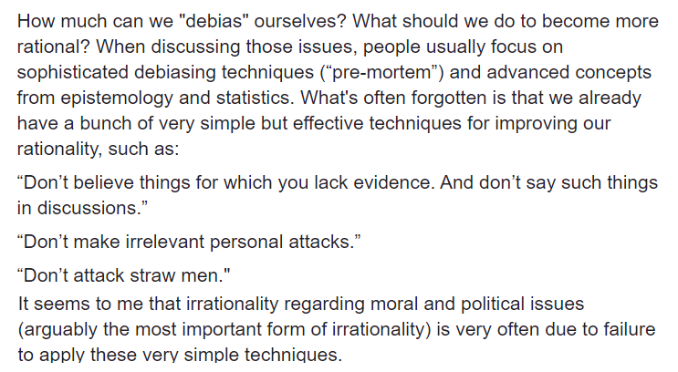 To improve our collective level of rationality, maybe what's most important isn't to learn sophisticated concepts and debiasing techniques, but to apply much simpler techniques that we always knew more consistently. https://www.facebook.com/stefan.schubert.3954/posts/1325619184305135 …pic.twitter.com/8iGztccrsd