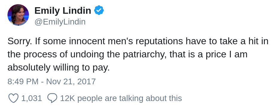 Right, what do we need due process, or the presumption of innocence for, when we can have mob rule to destroy people's lives so that we can undo the mystical patriarchy. Even though this imaginary evil structure advantages women the most. Right, good plan.