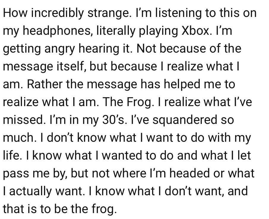 Good on you for not wanting to be a frog. Be a man. Work harder than you feel comfortable. Give to others. Read the Bible.