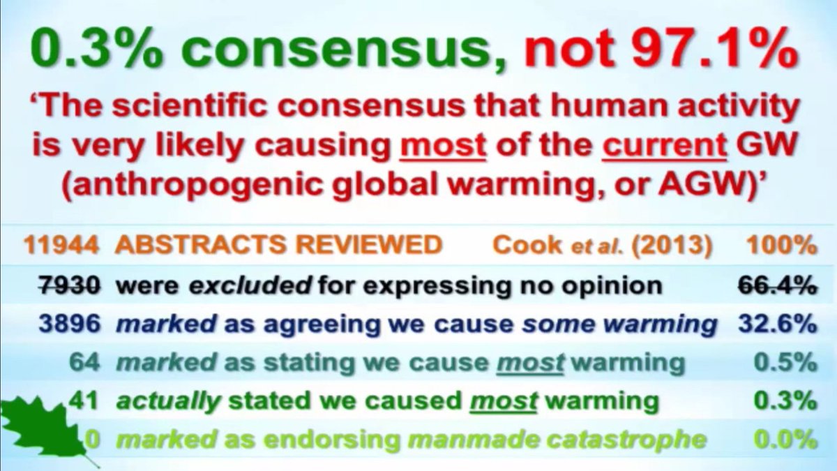 Bogus, disingenuous science marketing. "Most papers (66 per cent) actually took no position. Of the remaining 34 per cent, 33 per cent supported at least a weak human contribution to global warming. So divide 33 by 34 and you get 97%" https://www.fraserinstitute.org/article/putting-con-consensus-not-only-there-no-97-cent-consensus-among-climate-scientists-many …