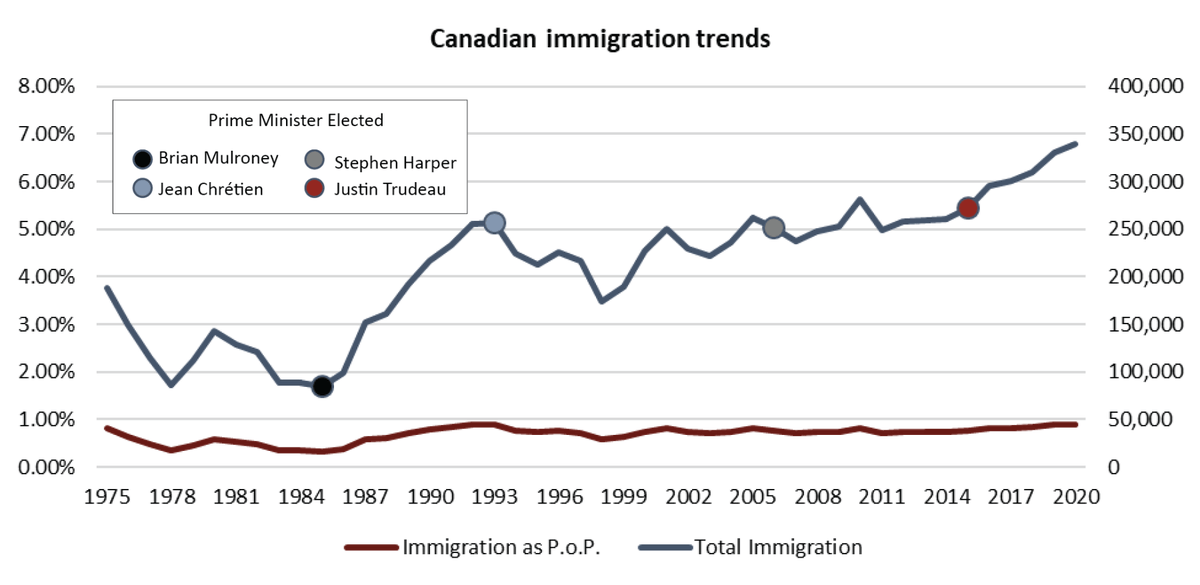 Yep. Tho like with the US Republicans, the Conservatives are just as much for mass immigration - check out immigration during the Mulroney years, when the Conservatives led.pic.twitter.com/6bRx91lK6I
