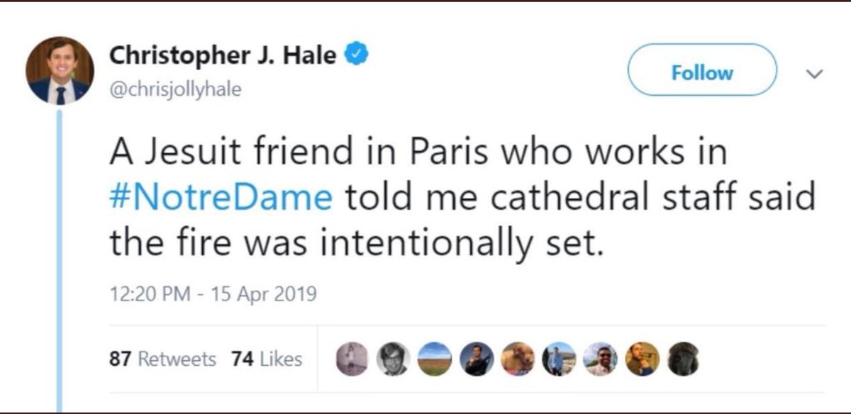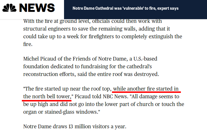 " while another fire started in the north bell tower" Wenn das stimmt, dann war es sehr wahrscheintlich #Brandstiftung. Zwei Start-Feuer simultan sind wenig wahrscheinlich. #NotreDame #ReichstagsbrandReloaded pic.twitter.com/MC7cjakrUj