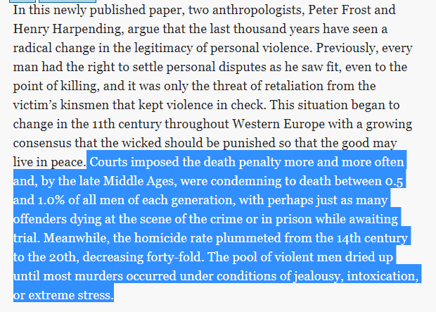 Ok, double checked - I moved a decimal point - it was .5% - 1% - but since it was over *centuries* the evolutionary effect is still clear The data was from England because that's where there were good records http://www.unz.com/pfrost/western-europe-state-formation-and-genetic-pacification-3/ …pic.twitter.com/RDZG0FmlSC