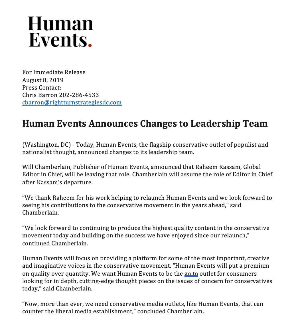 Announcing changes to the leadership team of @HumanEvents pic.twitter.com/cSsTiLZC5a