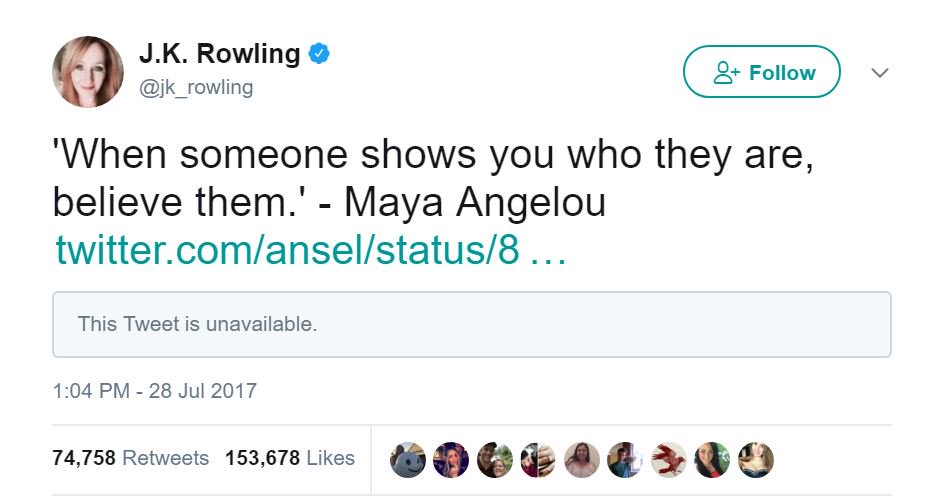 @PrisonPlanet Right 2 condemn@jk_rowling 4 slandering#Trump, but nasty & absurd 2 dismiss@DrMayaAngelou as "a prostitute"Thanks. Twitter will use this to make your timeline better. UndoUndo