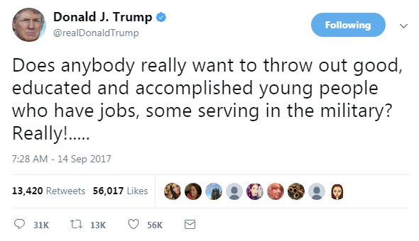 @realDonaldTrump WE DidNOT Vote for BLANKETAMNESTY FOR DACA NOR Make It Permanent. ONETIME DEAL FOR ONLY THOSE DESERVING IT.WHERE'S the WALLThanks. Twitter will use this to make your timeline better. UndoUndo