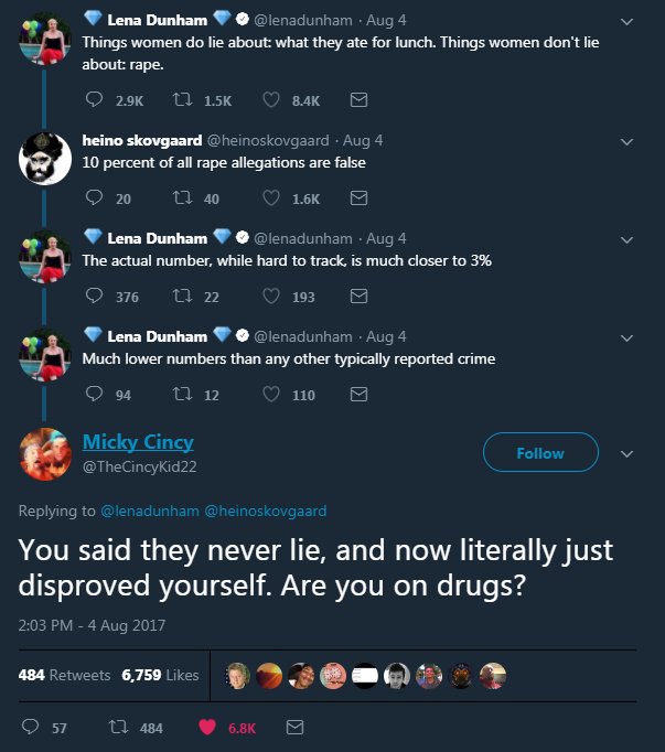 .@LenaDunham will see no contradiction between this post and her support of an accused rapist. Nothing a liberal says is part of any binding reality for them. Words are temporary, disposable; and truth is a rubber band.