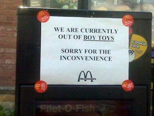 Grandboy was devastated the other day when they gave him a girl toy in his happy meal as he should have been. He was all excited after requesting a specific toy. Went back and they apologized and happily accommodated. Kudos