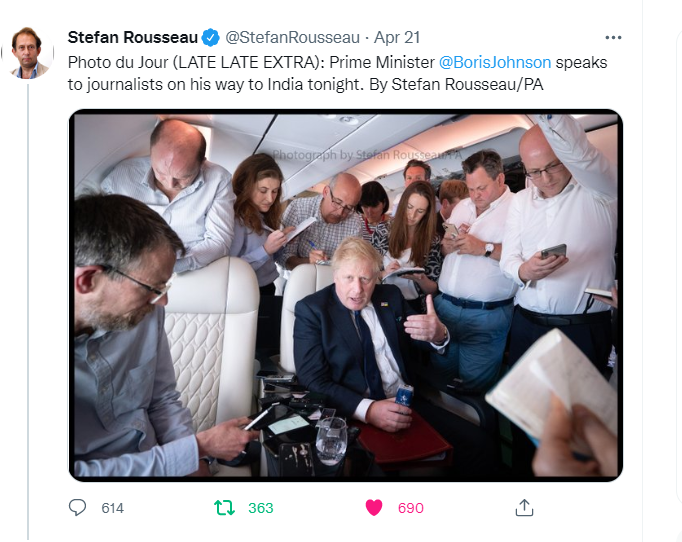 #UKPrimeMinsiter@BorisJohnson talking to Journalists on board his flight to India by@StefanRousseau is making waves in#India. Because India's Prime Minister has never given a proper press conference or talked to journalists where they ask challenging questionspic.twitter.com/J4kKFzYwR3