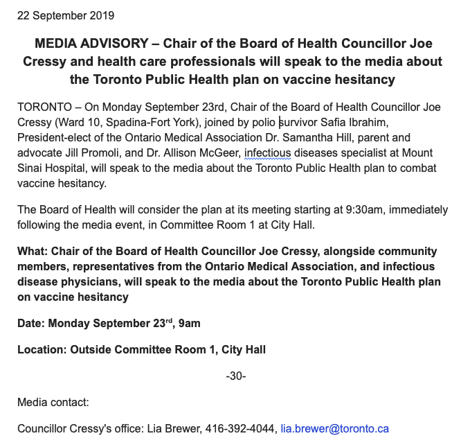 Vaccines have saved more lives than any other health care intervention in history. Tomorrow at 9am, alongside community members and health care professionals, I will speak to the media about our Toronto Public Health plan to combat vaccine hesitancy.pic.twitter.com/3KUKcxWqT3