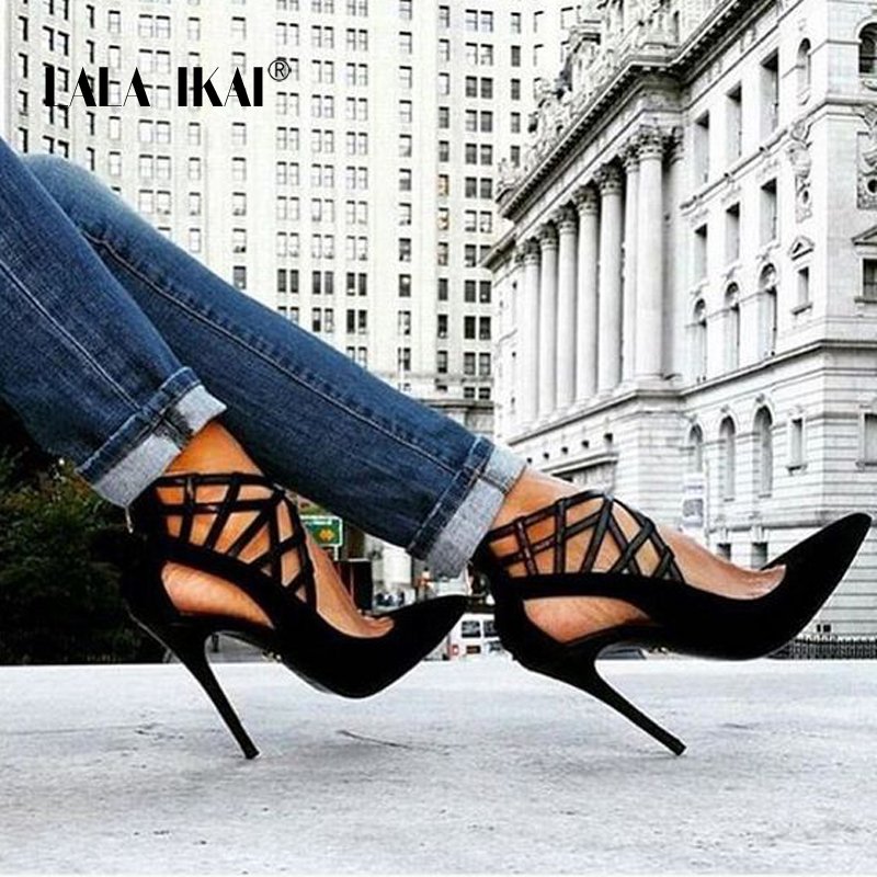 LALA IKAI Flock Zip High Heels Sandals 11.5CM Solid Fashion Openwork Cover Heel Sandals Thin Heel Woman Shoes 014C1698 -5