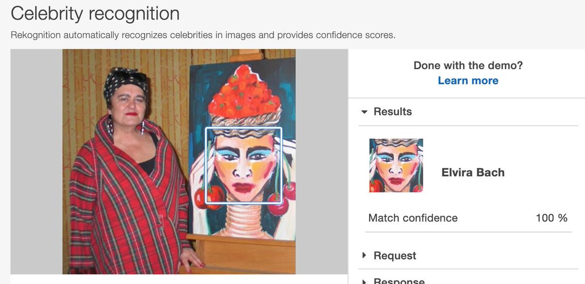 German artist Elvira Bach posing with her artworks as seen by Amazon's online facial recognition service. Apparently the model was trained with enough mis-labeled data that she evades detection while her paintings are reported instead with high confidence.pic.twitter.com/ms6tqX5DTe