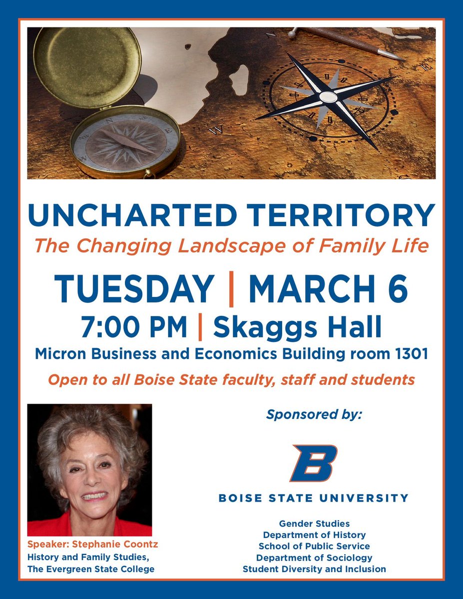 @StephanieCoontz, professor of history and family studies@EvergreenStCol, for a lecture titled "Uncharted Territory: The Changing Landscape of Family Life" at 7 p.m. Tuesday, March 6 in Skaggs Hall, Micron Business and Economics Building.pic.twitter.com/oK5mZuwBl9