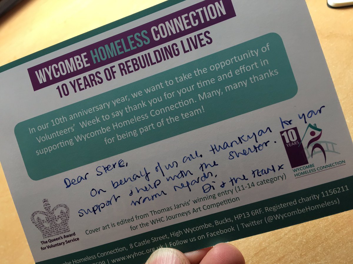 @WycombeHomeless for the 10th anniversary card in#VolunteersWeek. Please join me as a volunteer here: https://www.wyhoc.org.uk/volunteer pic.twitter.com/lLaEHH6Ge9
