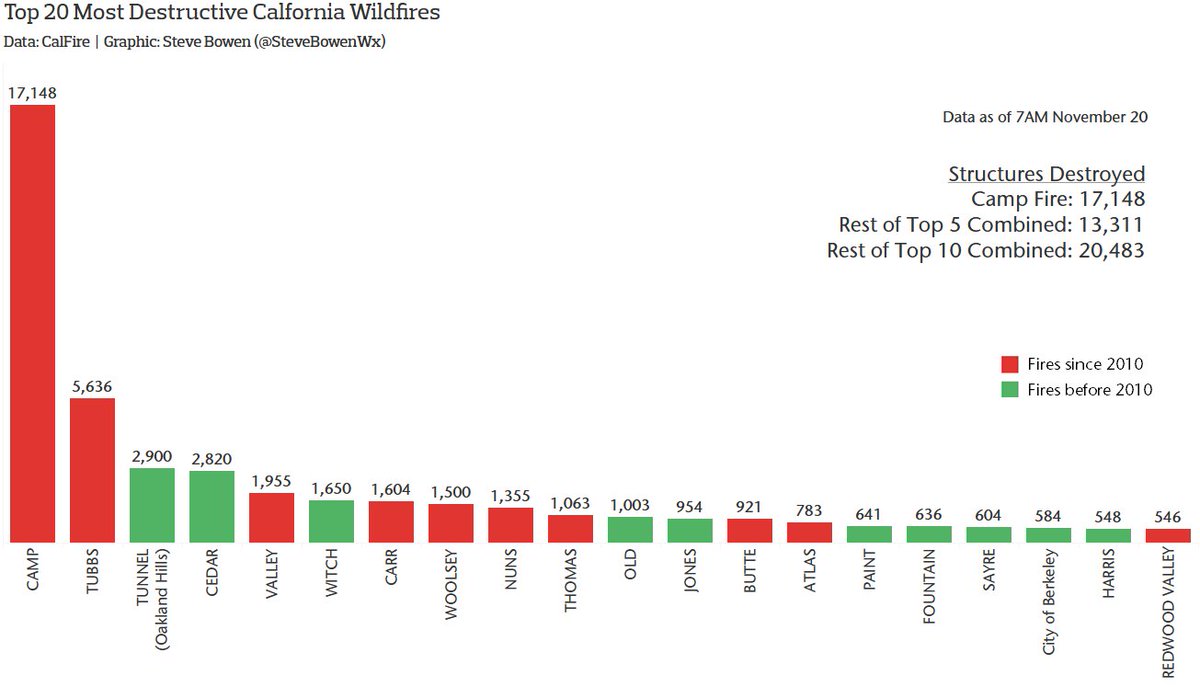 Nov. 20 AM Update: #CampFire has destroyed 17,148+ structures. This includes 12,947+ homes -- equal to 13% of all Butte County housing units. ***Amazing: 8 California wildfires from Oct. 2017 to Nov. 2018 have destroyed 29,635+ structures***pic.twitter.com/PnfPj0voz9