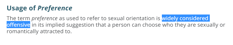 As recently as last month, Webster’s Dictionary included a definition of “preference” as “orientation” or “sexual preference.” TODAY they changed it and added the word “offensive." Insane - I just checked through Wayback Machine and it’s real. (via @ThorSvensonn & @chadfelixg)pic.twitter.com/oOq1SNtCP2