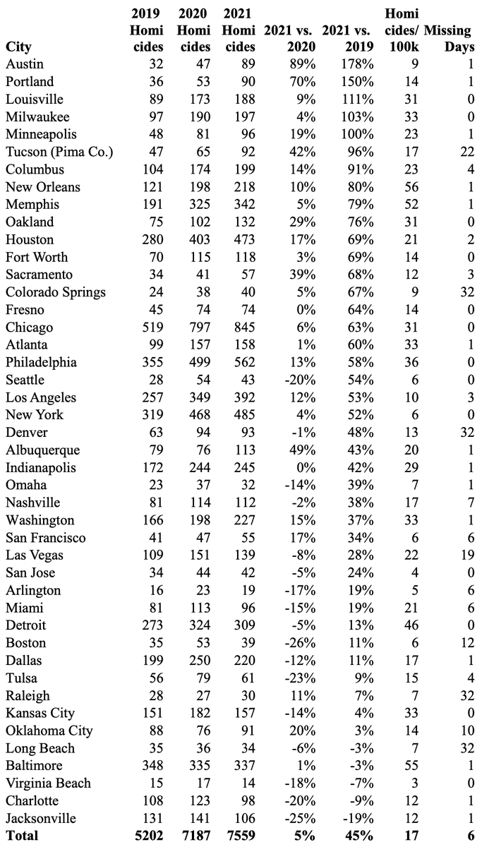 For the total data and analysis on 2021 homicide rates in 44 big cities, see my new column at Taki's Magazine: https://www.takimag.com/article/killer-stats-2022/ …pic.twitter.com/HOoRcQS8C3