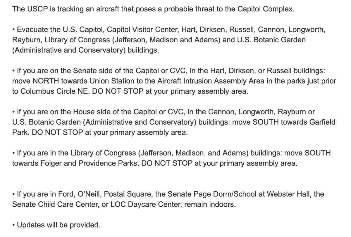 U.S. Capitol Police alert just now: “The USCP is tracking an aircraft that poses a probable threat to the Capitol Complex.” Immediate evacuations orderedpic.twitter.com/I4oxv06jrG