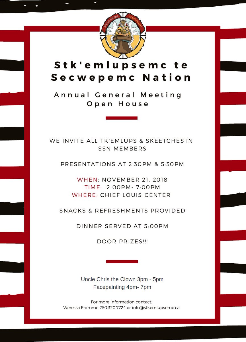 @Tkemlups &#Skeetchestn members have 2 opportunities to get an update on SSN activities at the SSN Open House and AGM