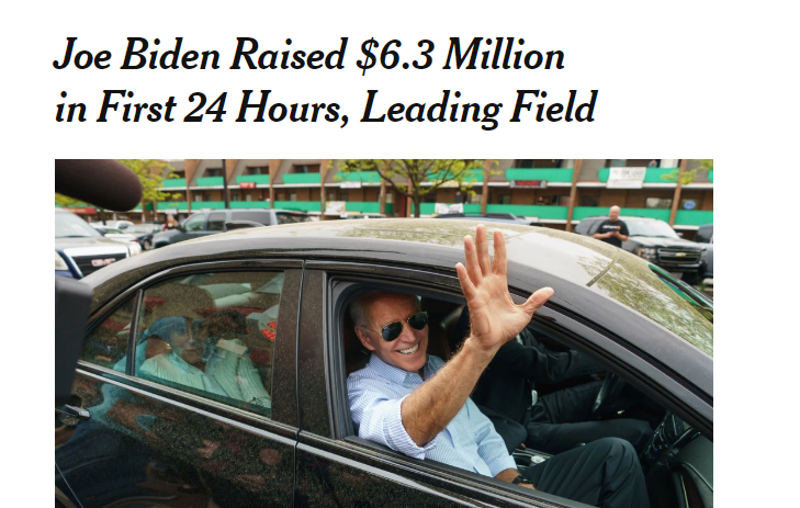It took a private $2,800/plate fundraiser hosted by a Comcast executive for Joe Biden to barely out raise Bernie Sanders on his first day. Sanders had more than twice as many donors (225k to 96k)