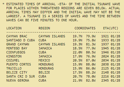 #tsunami warnings. Guidance from@NWS_NTWC shows possible waves 1 to 3 feet for Belize, Cuba, Honduras, parts of Mexico, Cayman Is. and Jamaica. Arrival times of the *minor* tsunami waves attached. EST is UTC minus 5. M7.7 happened 19:10zpic.twitter.com/XY7prLb5hO