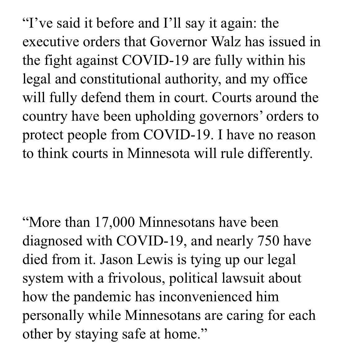 #mnsen Republican candidate @LewisForMN sues over @GovTimWalz #covid19 restrictions, saying they violate his constitutional rights to campaign as he wishes -- rallies, dinners, speeches, travel etc. https://lewisformn.com/wp-content/uploads/2020/05/Complaint.v4-051920.pdf …