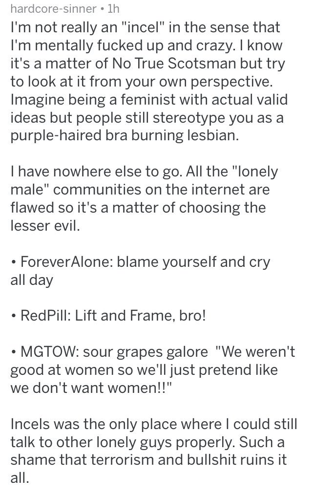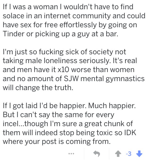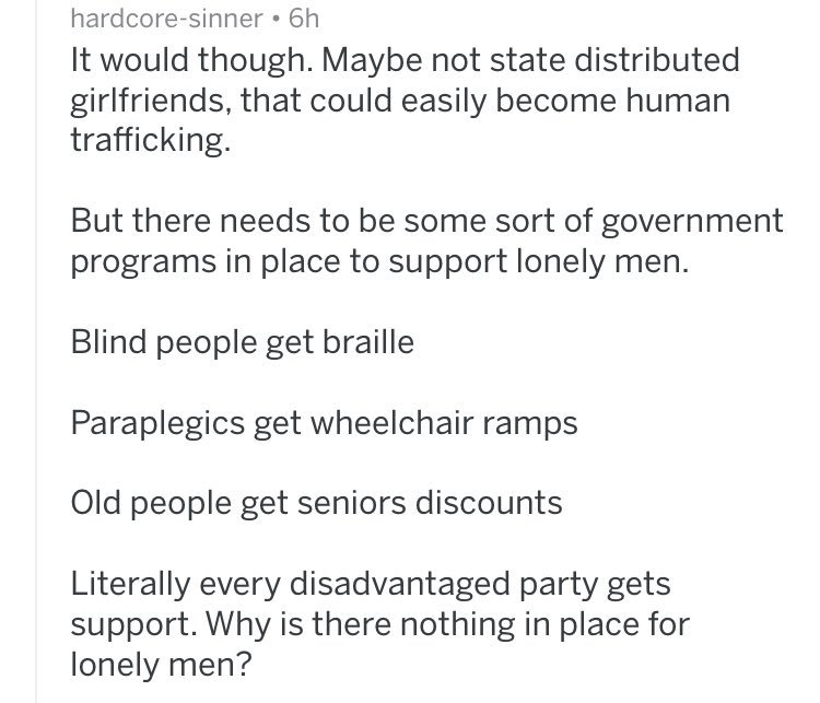 That’s the problem with these incel communities and the terrorists they create. They’re *entirely* based on male entitlement. Thinking that being lonely is a disability on par with being blind and that they should be entitled by society to have that fixed for them.