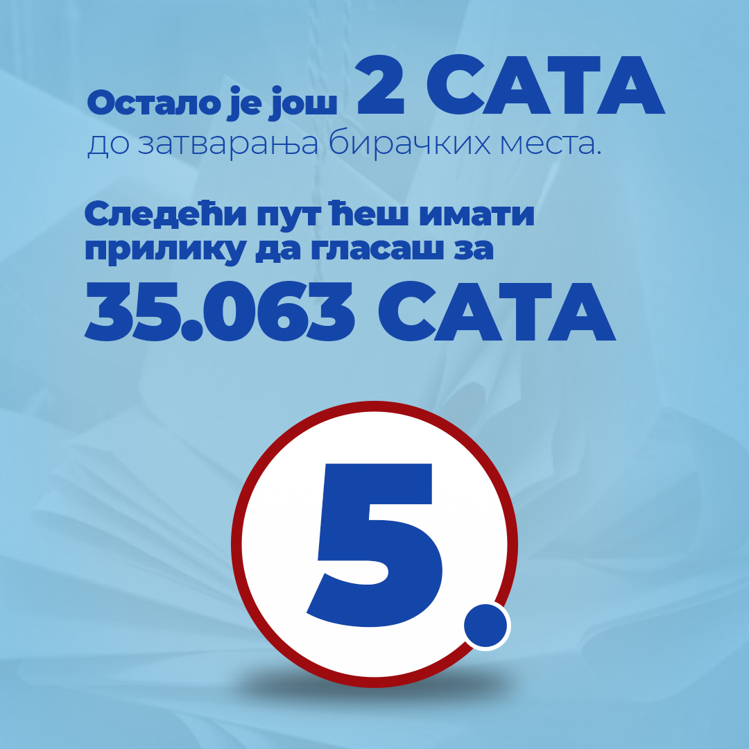 Ostalo je još 2 sata do zatvaranja biračkih mesta. Sledeći put ćeš imati priliku da glasaš za 35.063 sata.pic.twitter.com/CtOwlo4DiO