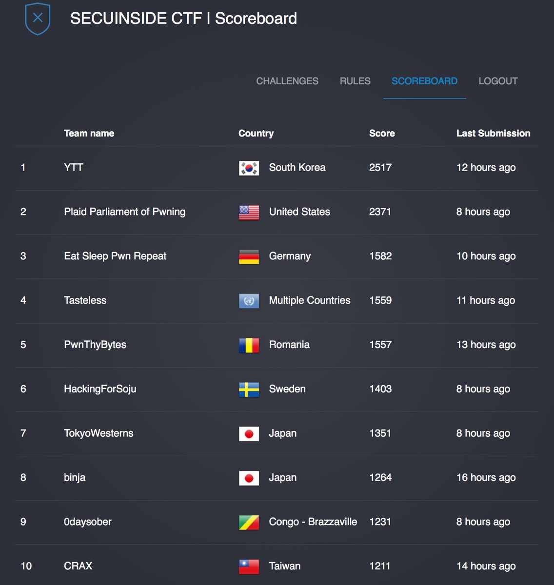 #32c3ctf is over. You all did great :) Top 3: 1. pasten 2.@DragonSectorCTF 3. First Orderpic.twitter.com/eK4jKCTCxB