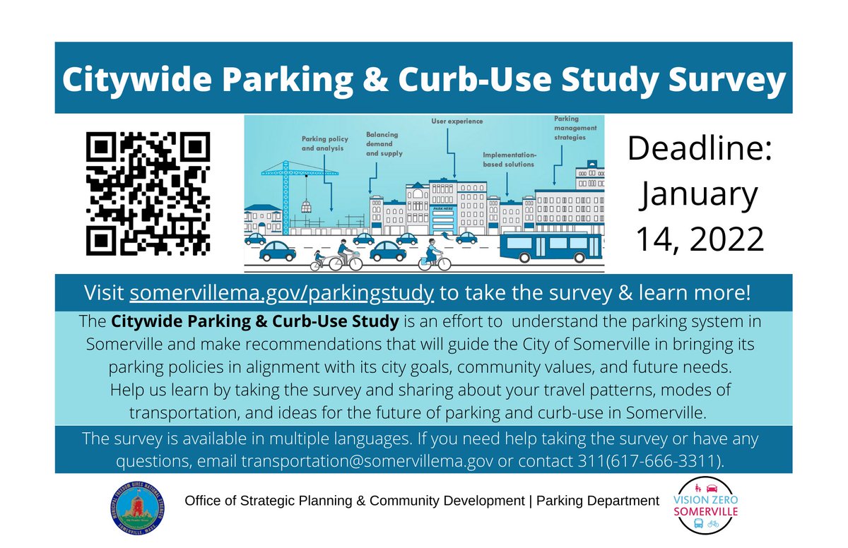 We are still accepting responses for our Citywide Parking & Curb Use Study through 1/14/2022. This survey will provide vital insights into existing travel patterns and public priorities for parking management and curbside space. http://somervillema.gov/parkingstudy .pic.twitter.com/BAqL3XPaDK