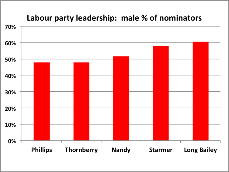 If I've counted correctly, the leadership candidate with the 'malest' set of people nominating them is