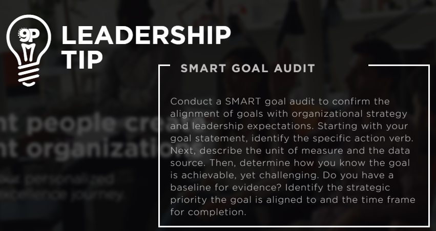 Strategy Meet Execution. Conduct a SMART goal audit to confirm the alignment of goals with organizational strategy and leadership expectations. Identify the strategic priority, the unit of measure, the data source; and the actions and time frame for completion.