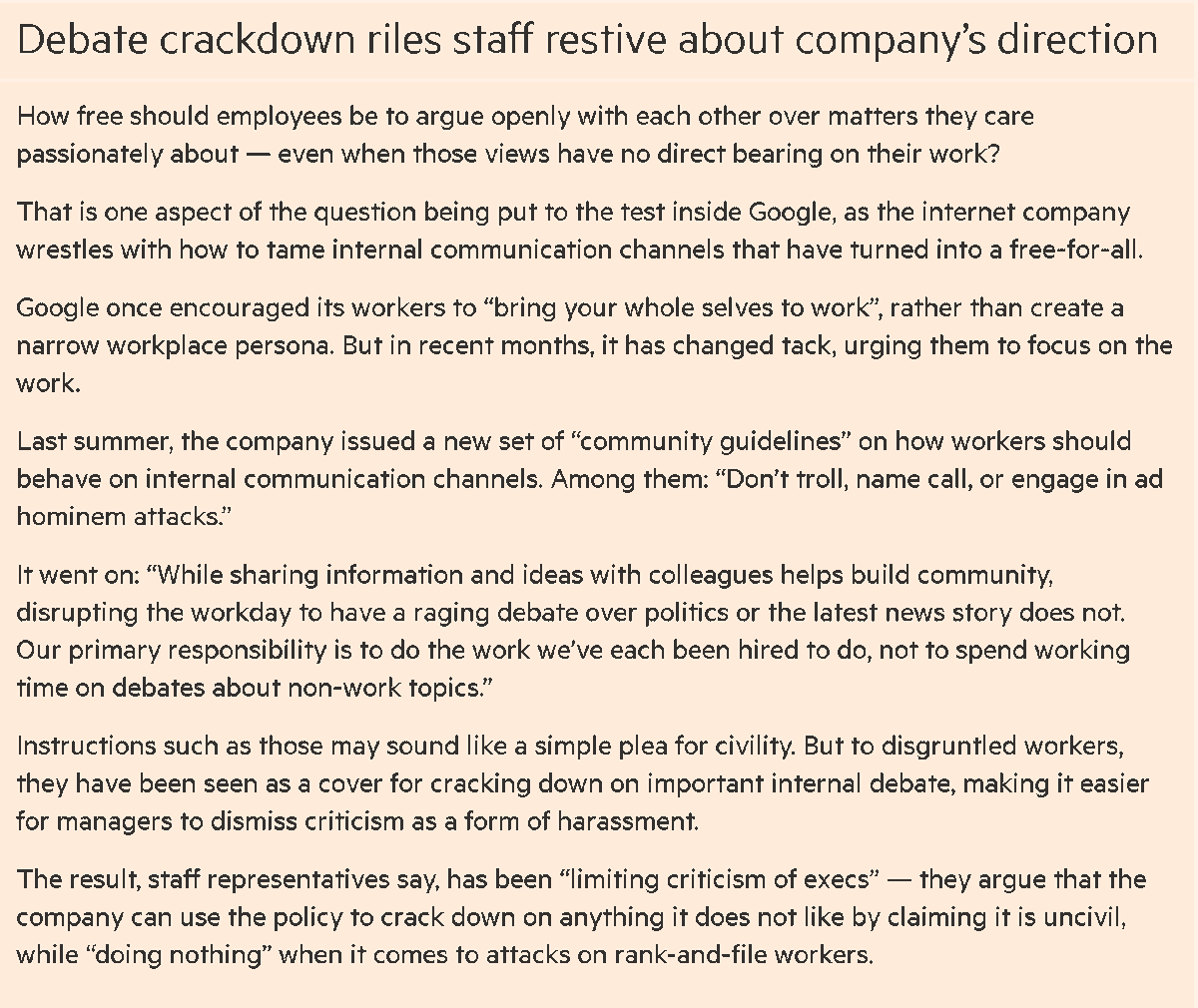 Do no trolling. "Google once encouraged its workers to “bring your whole selves to work”, rather than create a narrow workplace persona. But in recent months, it has changed tack, urging them to focus on the work." https://www.ft.com/content/86b00e9a-33a1-11ea-a329-0bcf87a328f2 …pic.twitter.com/BbYn9BxS53