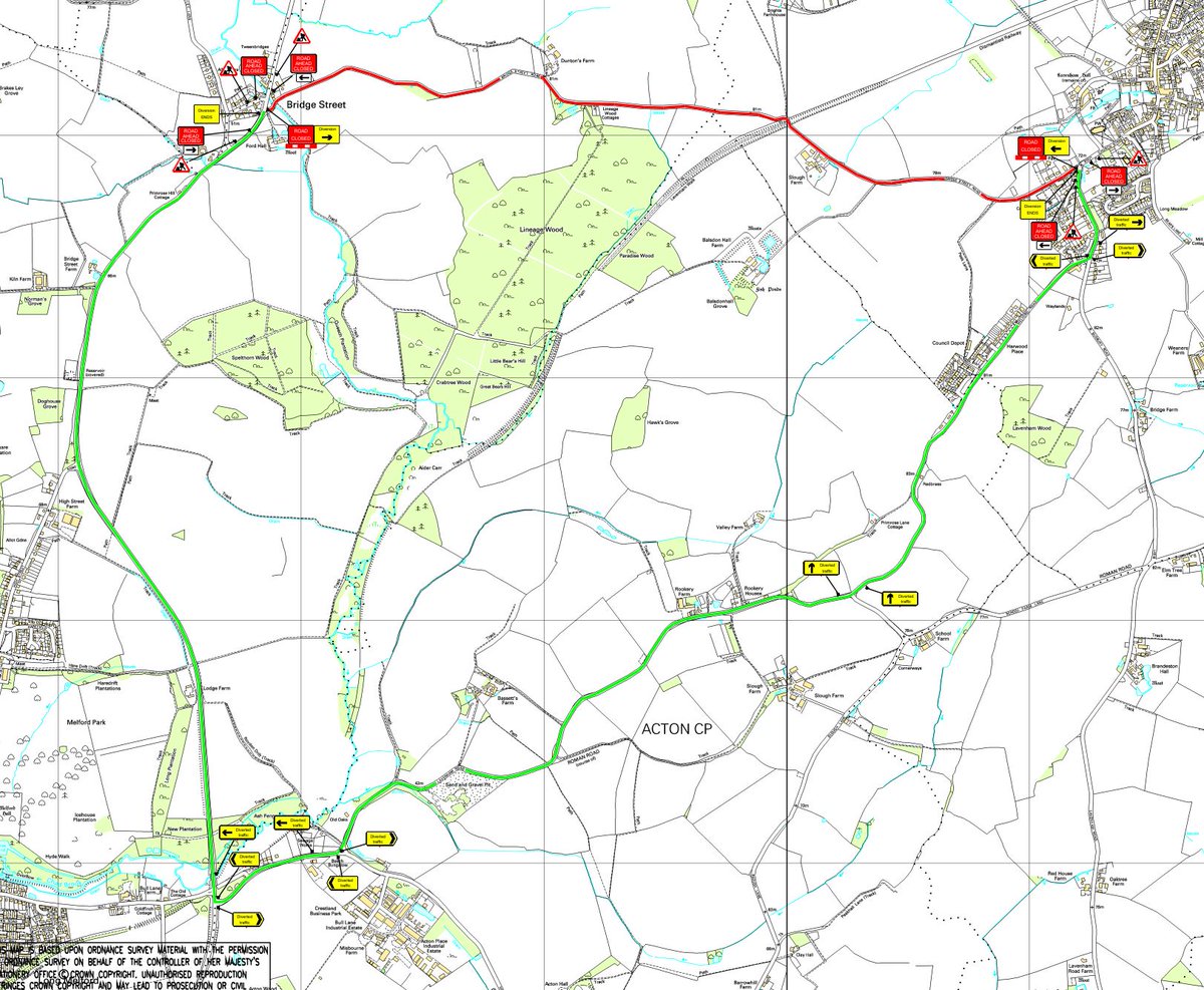 2/2 Please follow the diversion - Lower Road, Valley Wash, Chimney Street, Barnardiston Road, Hundon Road, Greys Lane, A143, B1061, Mill Road, Hundon Road, Kedington Road, Brockley Green Road, Clare Road and vice versa.