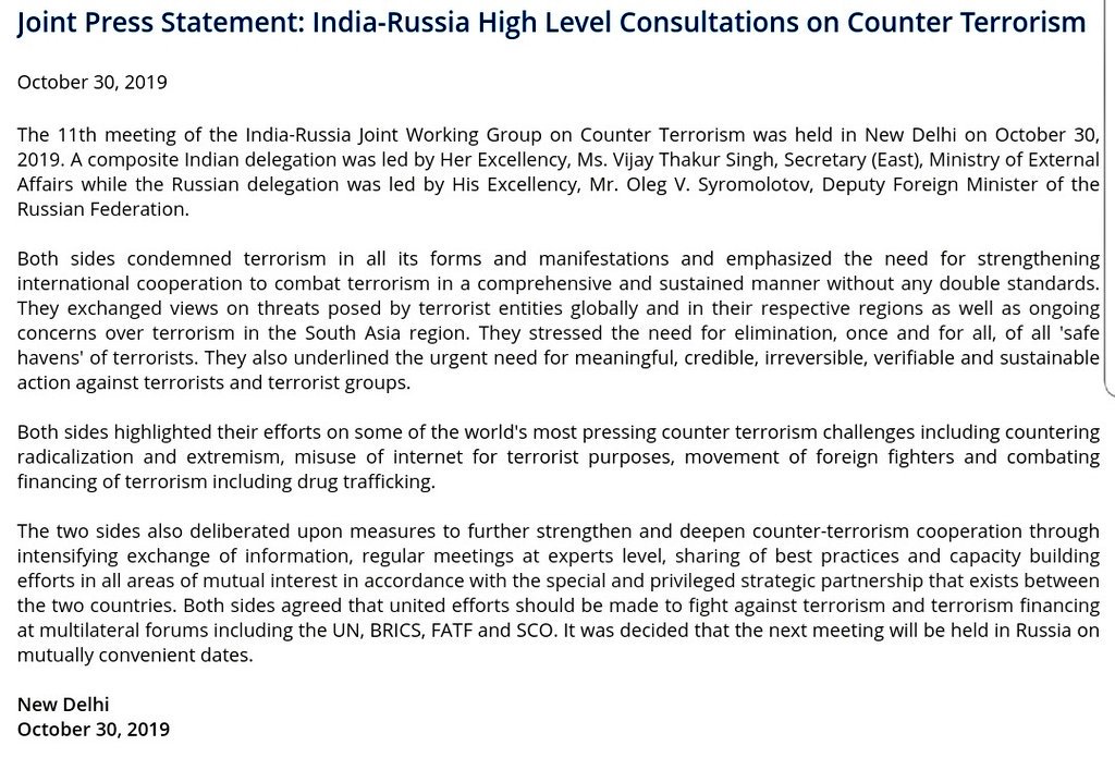 India, Russia stree for the need to eliminate "safe haven" for terrorist and underline the need for meaningful, credible, irreversible, verifiable and sustainable action against terrorists and terrorist groups: India, Russia joint statement after consultations on counter terrorpic.twitter.com/eZ9nUIAWoG